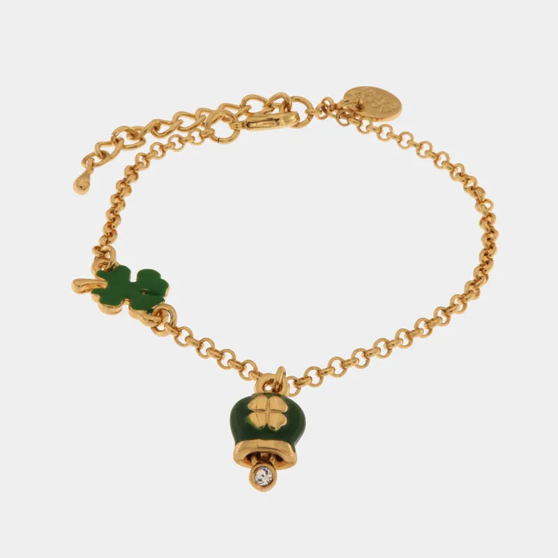Bracciale in Metallo con cuore e campanella portafortuna verde con quadrifoglio