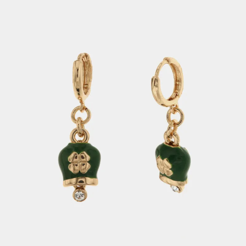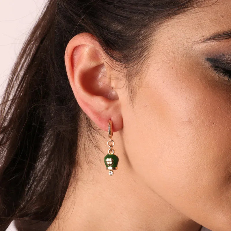 Orecchini in Metallo a cerchio con campanella portafortuna verde con quadrifoglio pendente
