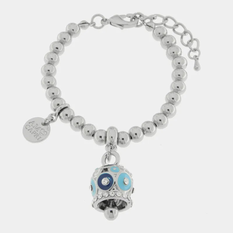Bracciale in Metallo con campanella a pois blu e azzurro e zirconi