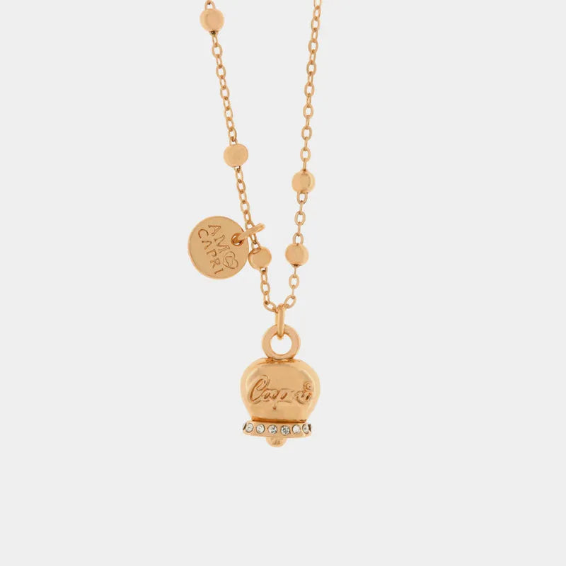 Collana in Metallo con campanella portafortuna pendente impreziosita da cristalli bianchi e scirtta Capri a rilievo