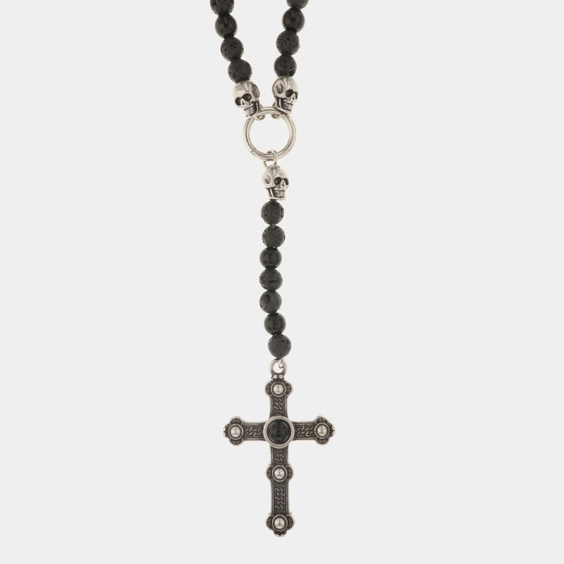 Collana in Acciaio sfere color lava nera con pendente a forma di croce e teschi