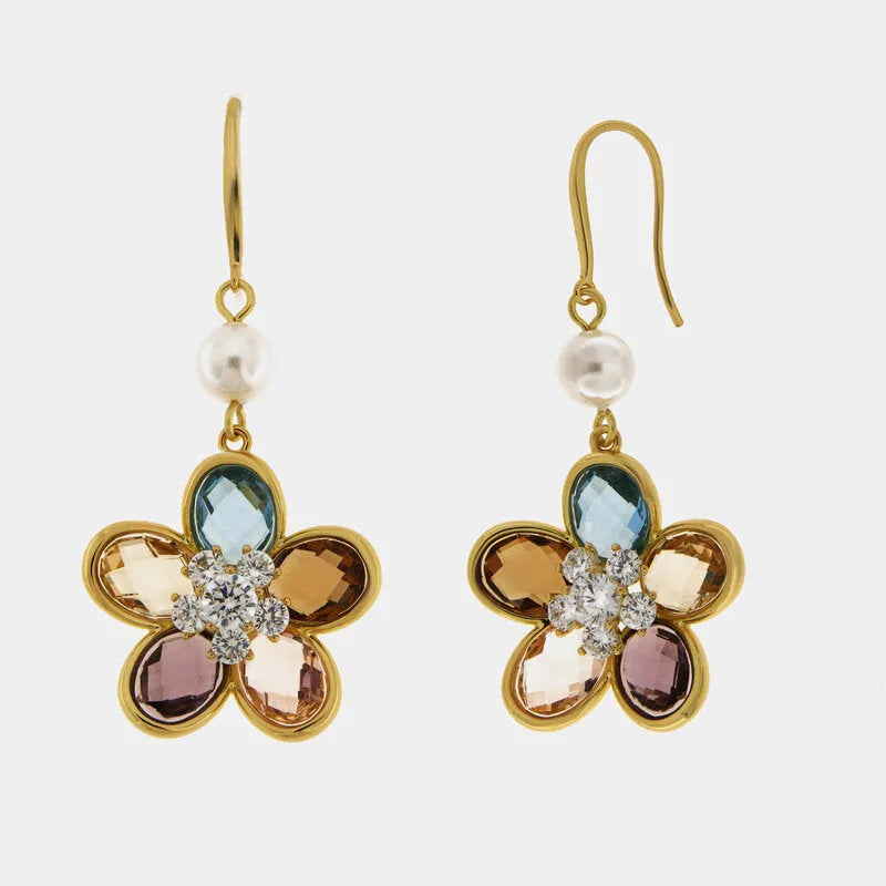 Orecchini in Metallo pendenti donna a forma di fiore con cristalli oleografici e sfere satinate