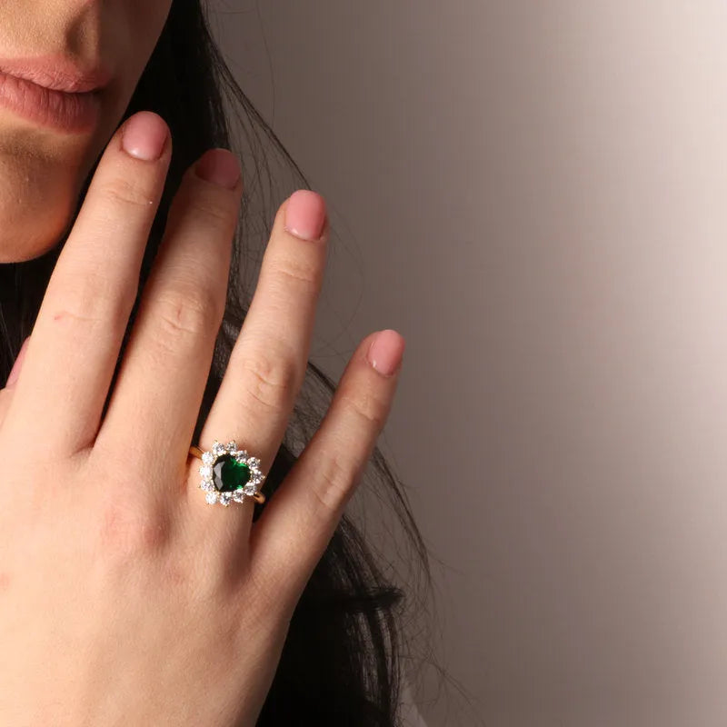 Anello in Argento 925 solitario con cuore in zirconi verde smeraldo e bianchi
