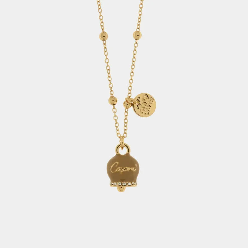 Collana in Metallo campanella portafortuna in smalto caffè, con scritta Capri a rilievo e cristalli bianchi