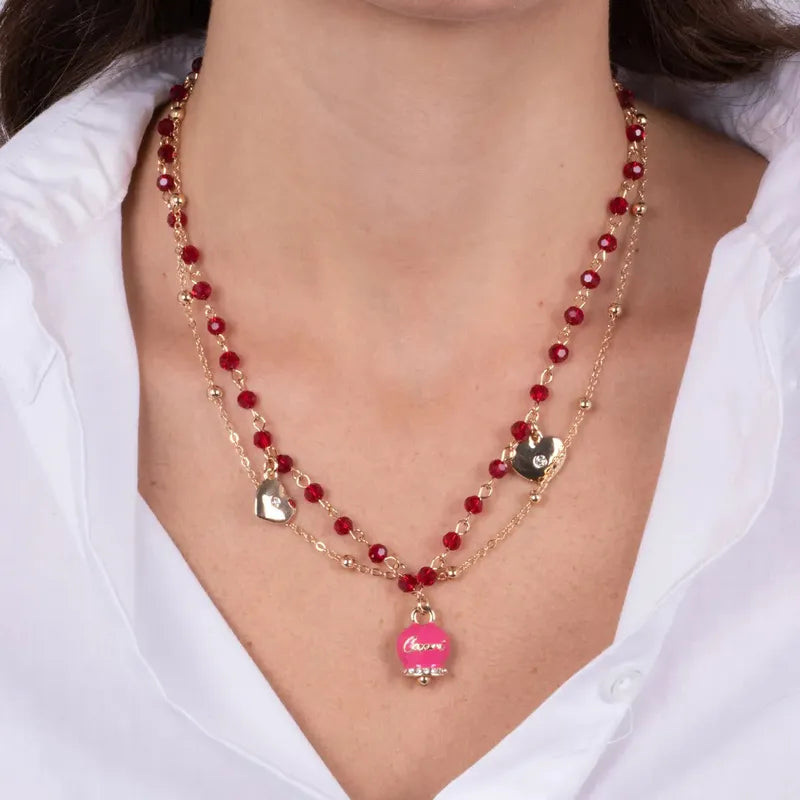 Collana in Metallo multifilo con campanella fucsia e pietre rosse