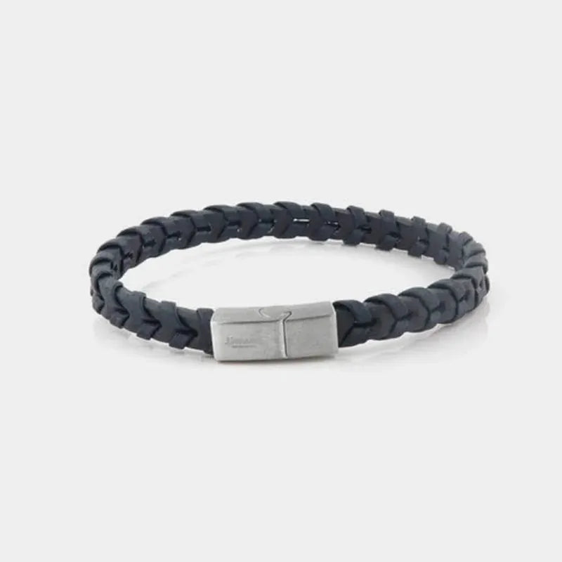 Bracciale in Acciaio rigido in pelle blu intrecciata. Chiusura a scomparsa