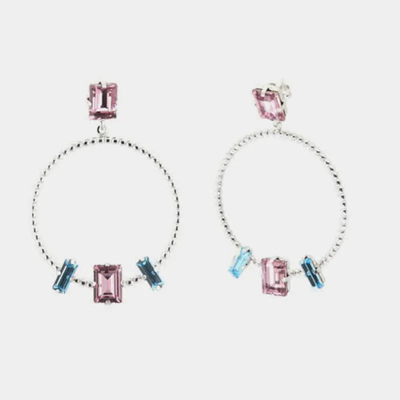 Orecchini in Argento 925 con punto luce a lobo e cerchio pendente puntellato con cristalli carrè colorati.