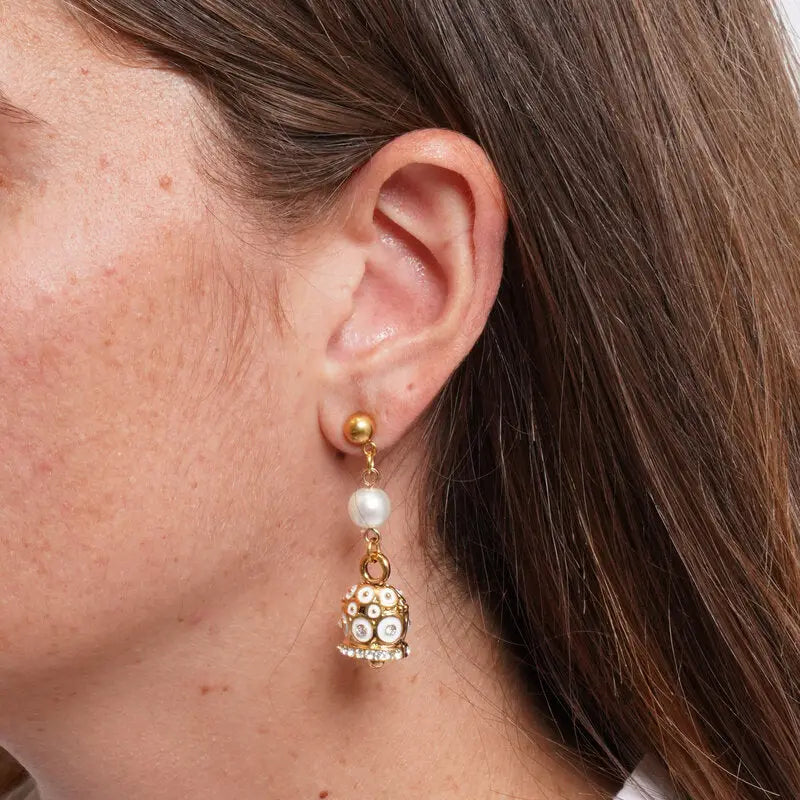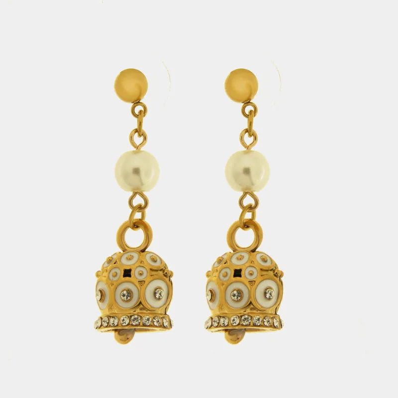 Orecchini in Acciaio con perle e campanelle a pois bianchi impreziosite da cristalli