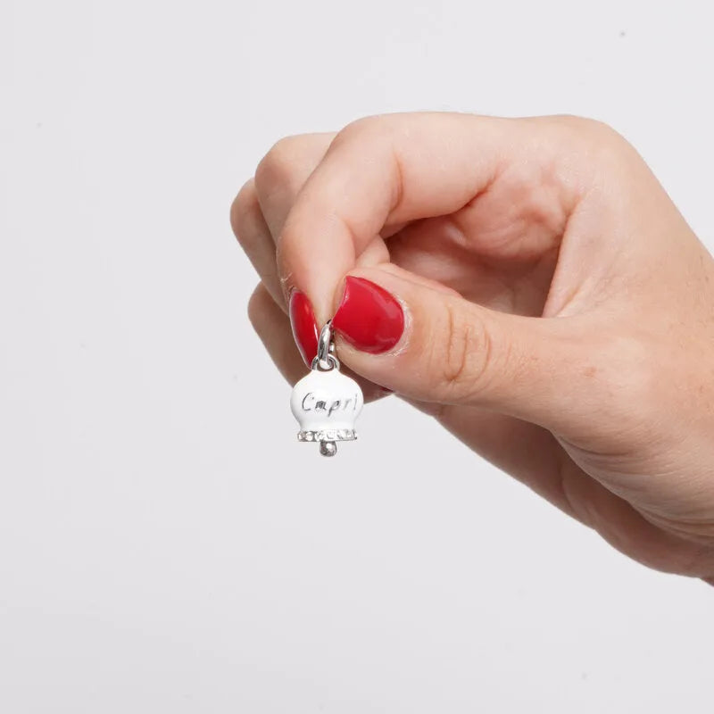 Ciondolo in Acciaio campanella bianca con scritta Capri e zirconi