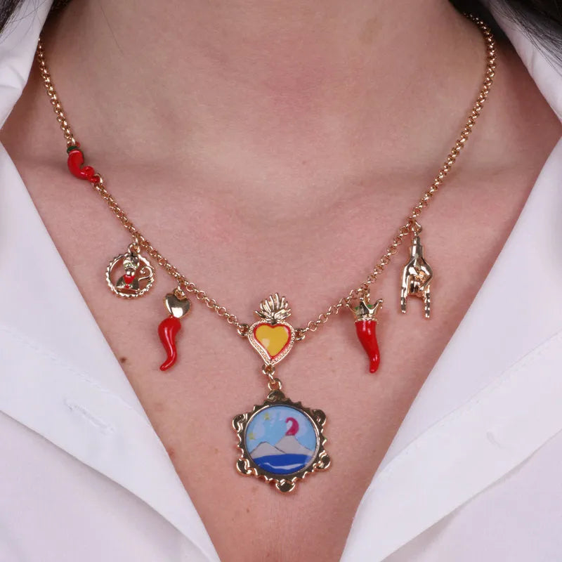 Collana in Metallo con cornetti, cuore sacro, corna e Vesuvio