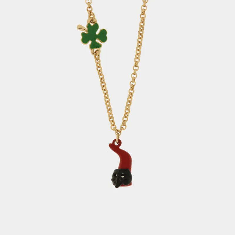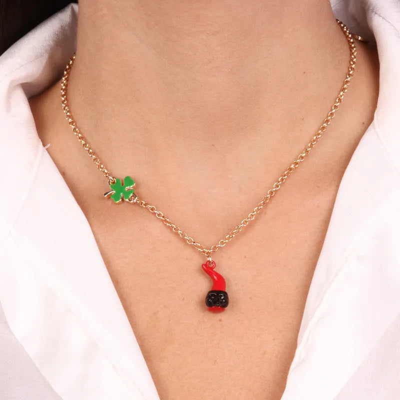 Collana in Metallo con cornetto portafortuna impreziosito da smalto rosso a forma di Pulcinella