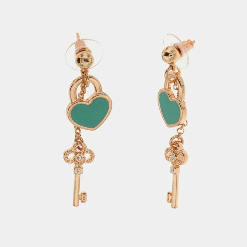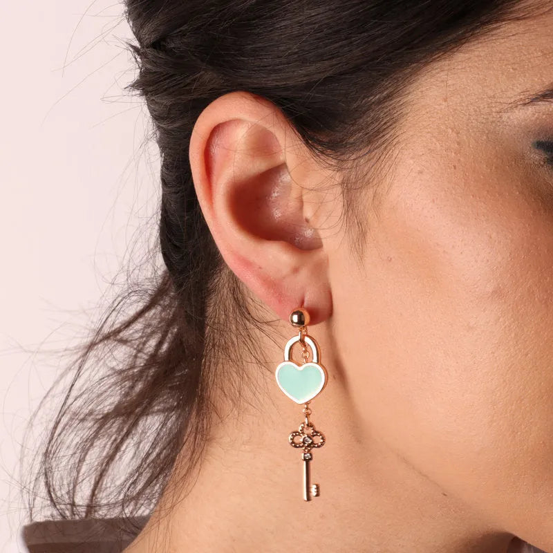Orecchini in Metallo con lucchetto a cuore e chiave con smalto turchese e cristalli bianchi
