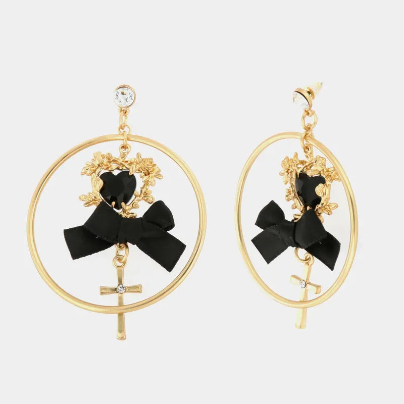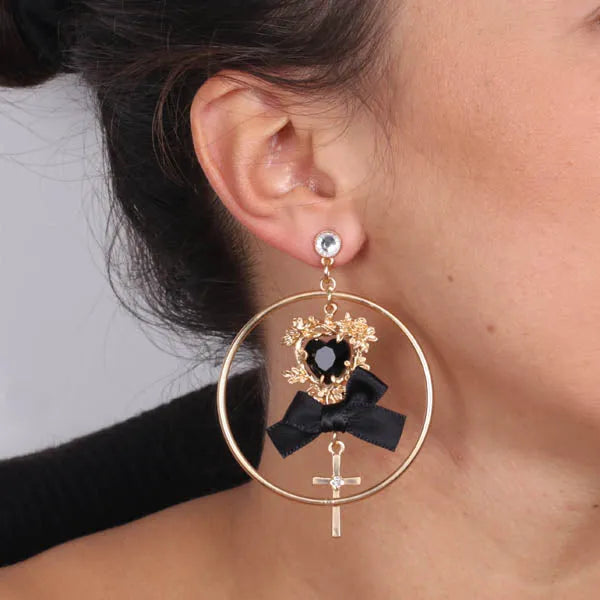 Orecchini in Metallo a cerchio con nastro nero e croce pendente