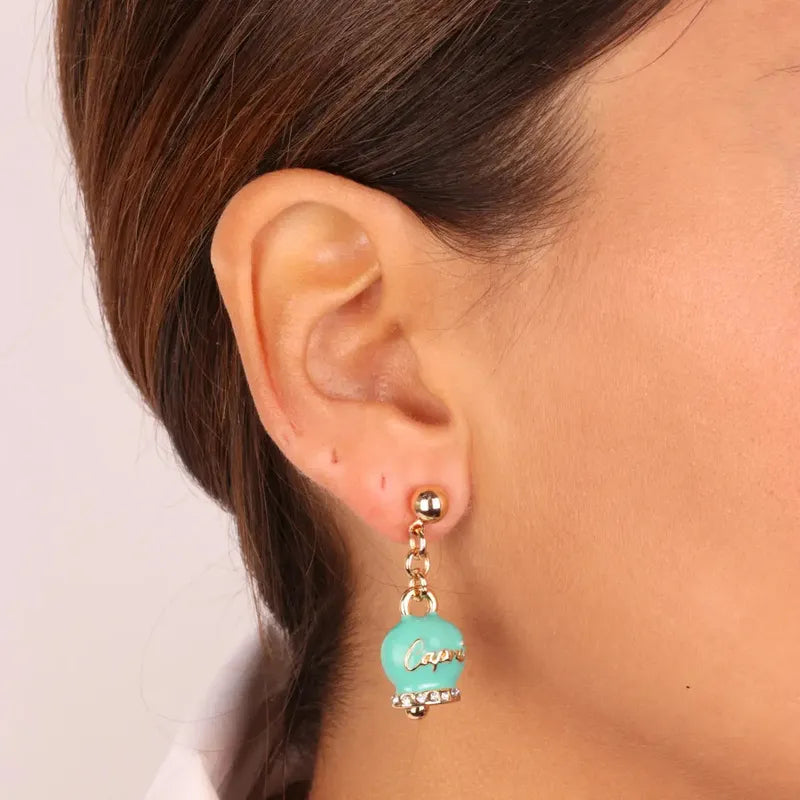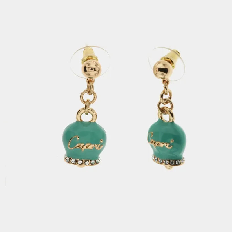 Orecchini in Metallo con campanella capri pendente in smalto verde acqua, impreziosita da cristalli