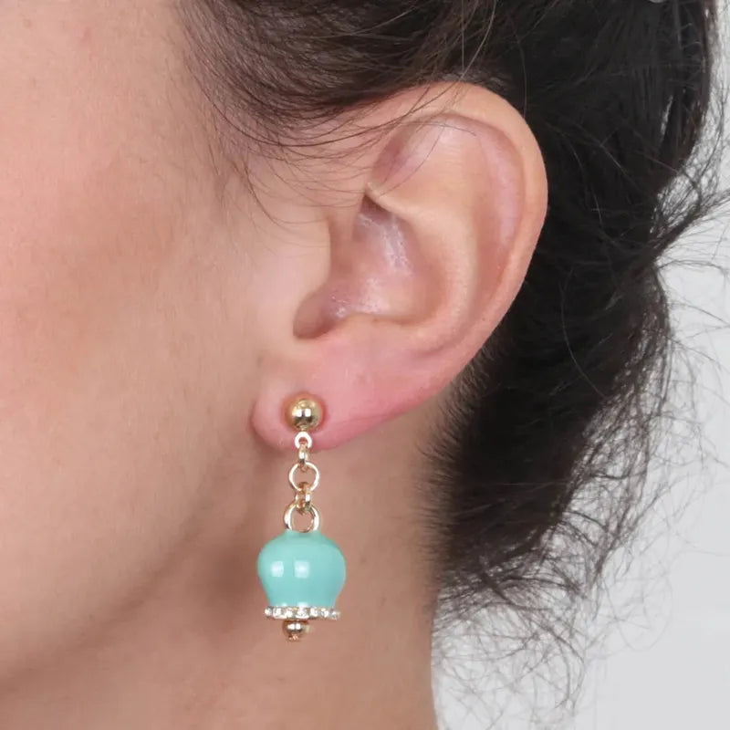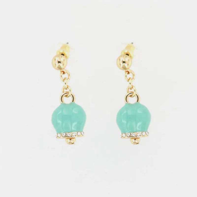Orecchini in Metallo con campanella portafortuna pendente, impreziosita da smalto verde e cristalli