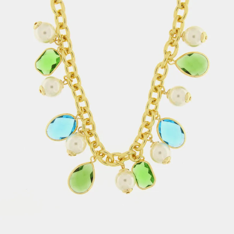 Collana in Metallo con cristalli blu e verdi e perle sintetiche