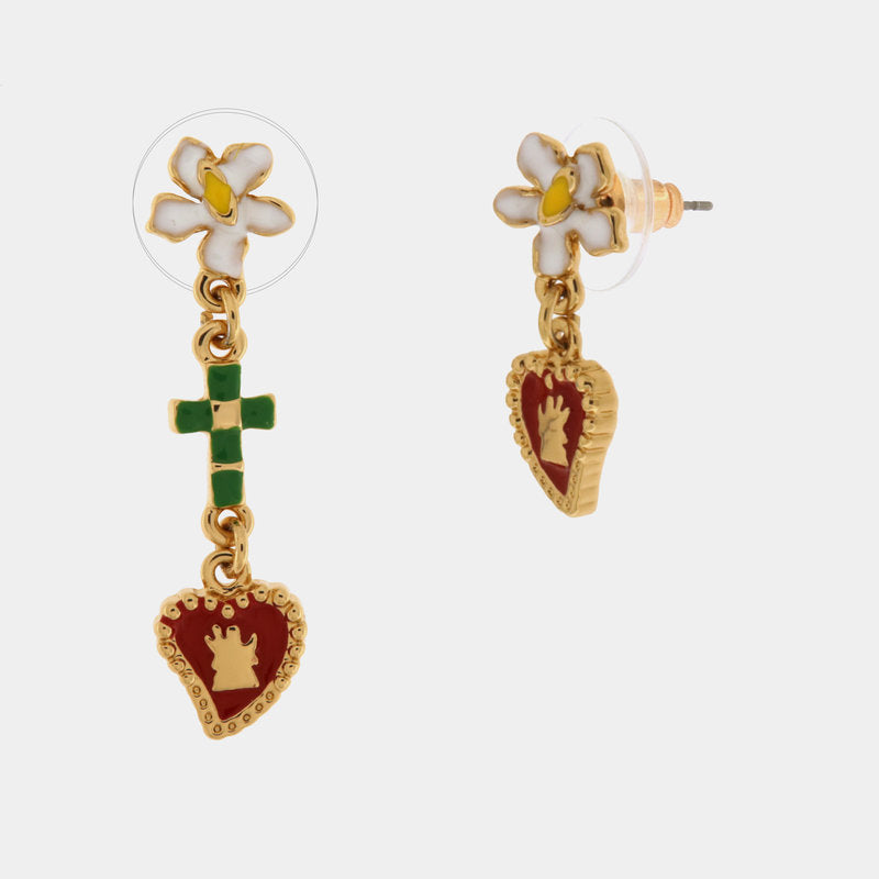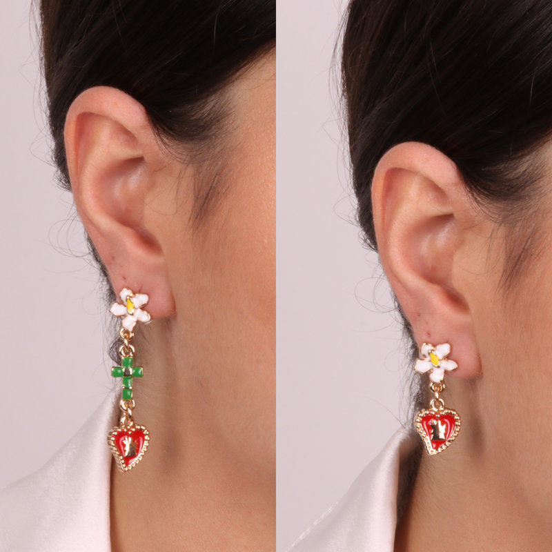 Orecchini in Metallo con cuore sacro, croce pendente e fiore a lobo