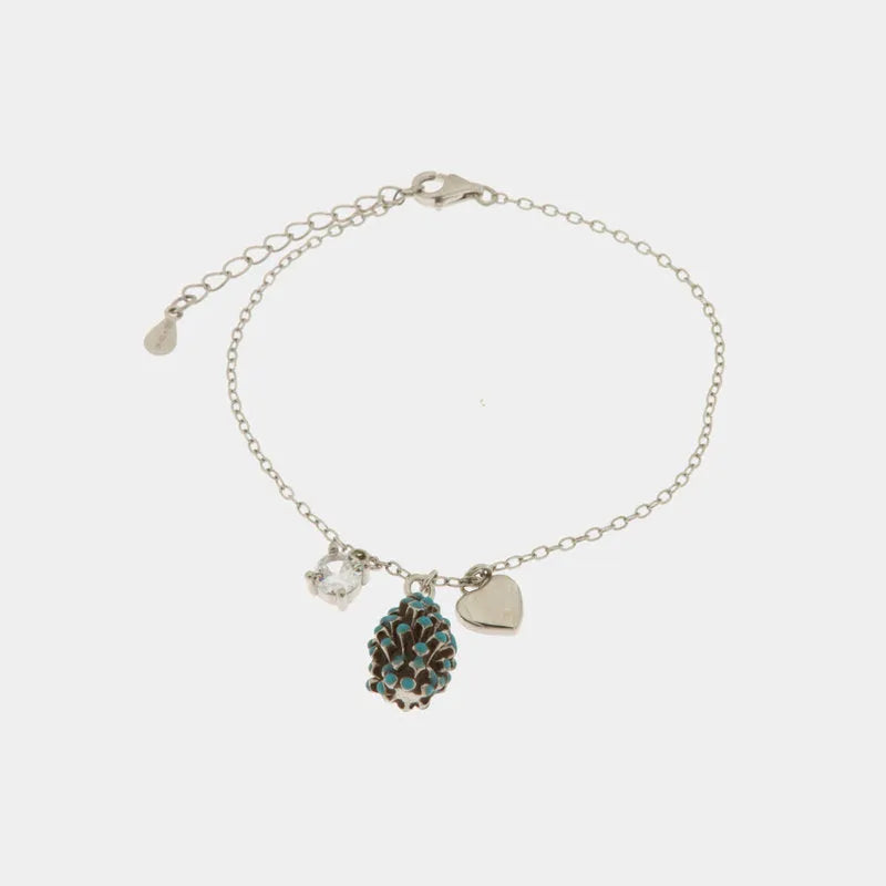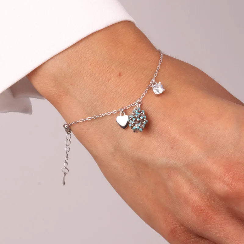 Bracciale in Argento 925 con pigna portafortuna impreziosito da zirconi blu e cuore pendente