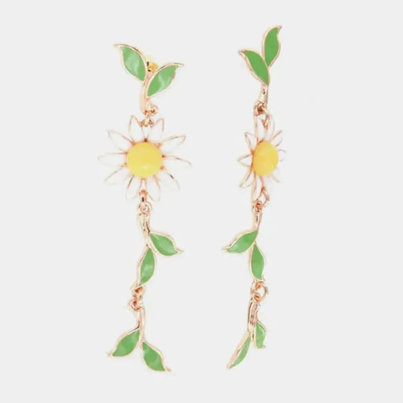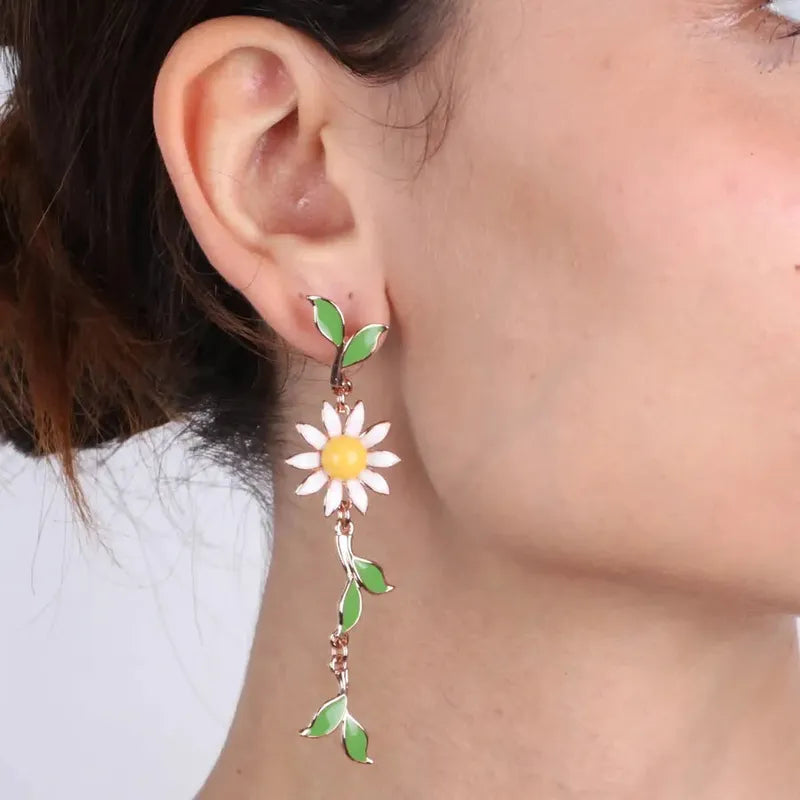 Orecchini in Metallo con margherita e foglie pendenti, impreziosite da smalti colorati
