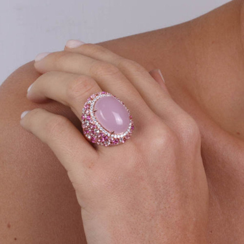 Anello in Argento 925 con ampio zircone rosa centrale impreziosito da pavè di zirconi multicolore e punti luce bianchi