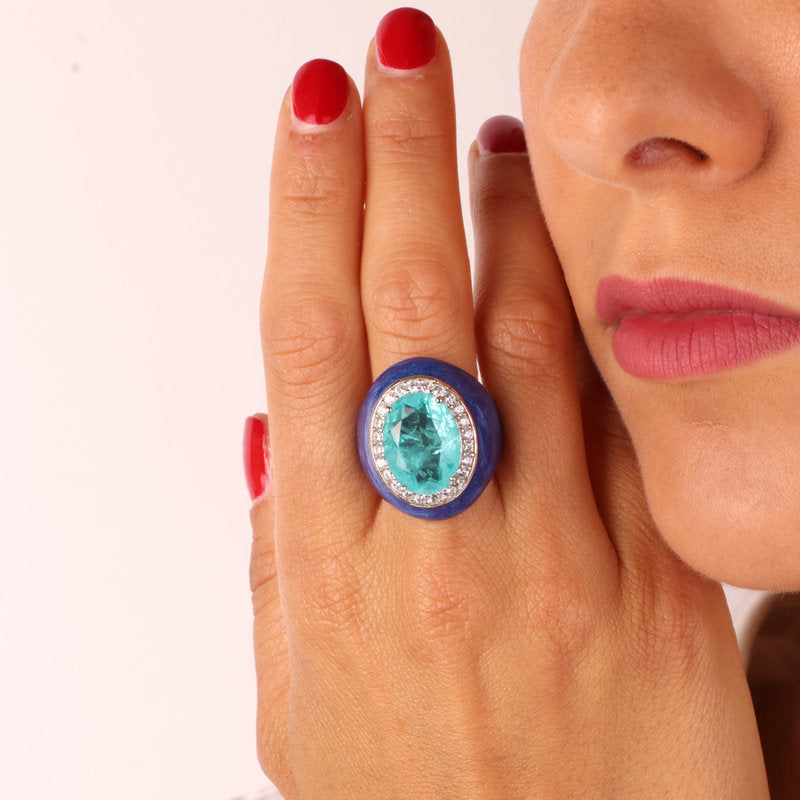 Anello in Argento 925 smaltato blu impreziosito da zirconi bianchi e zircone centrale icestone