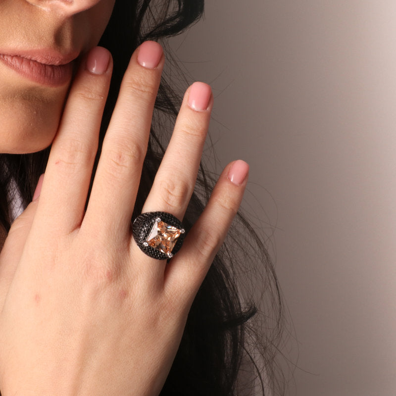 Anello in Argento 925 zircone champagne quadrato e zirconi neri