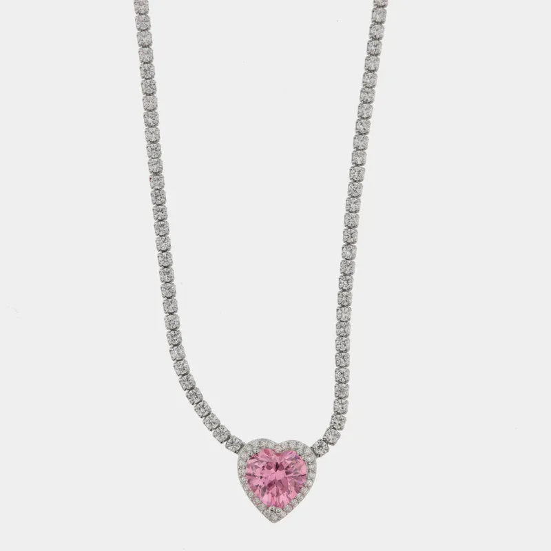 Collana in Argento 925 girocollo tennis in zirconi bianchi con cuore in zircone rosa