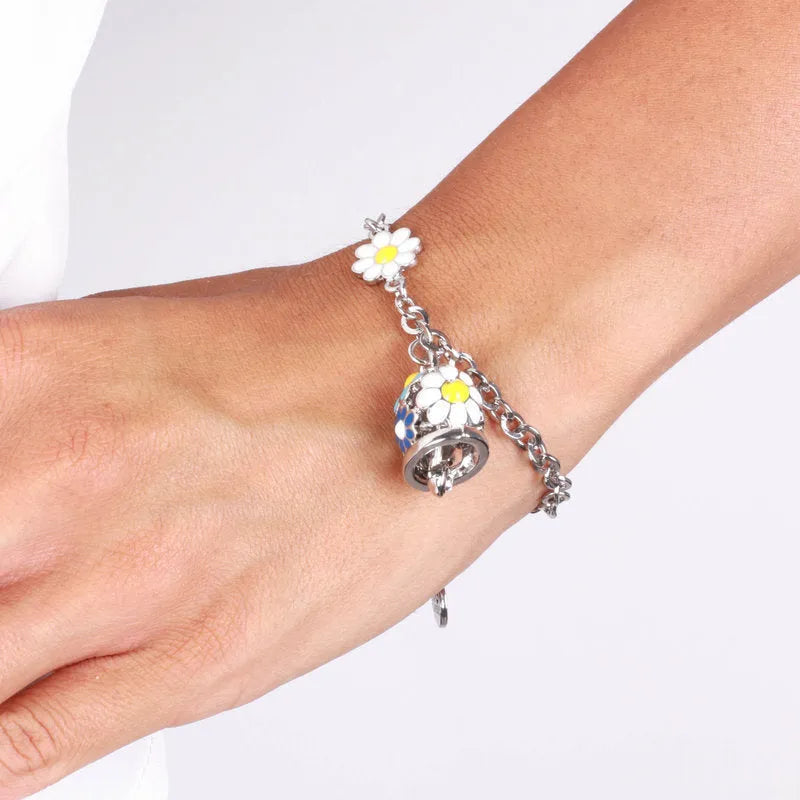 Bracciale in Metallo con campanella e margherite blu e bianche