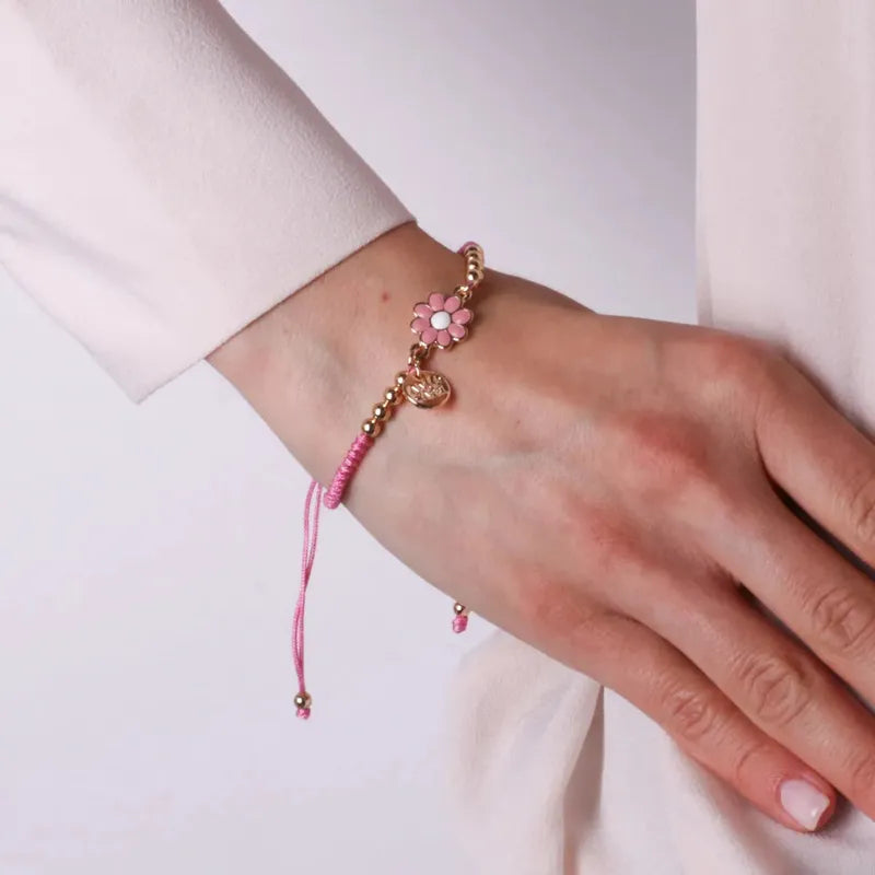 Bracciale in Metallo con cordino rosa e sfere con margherita
