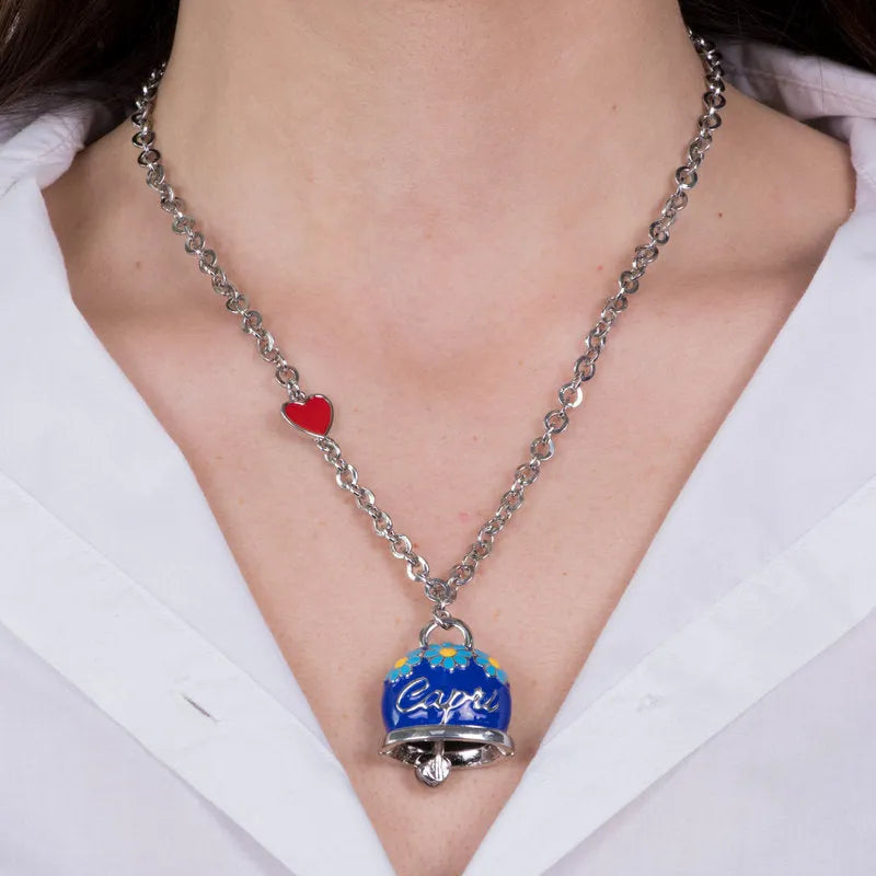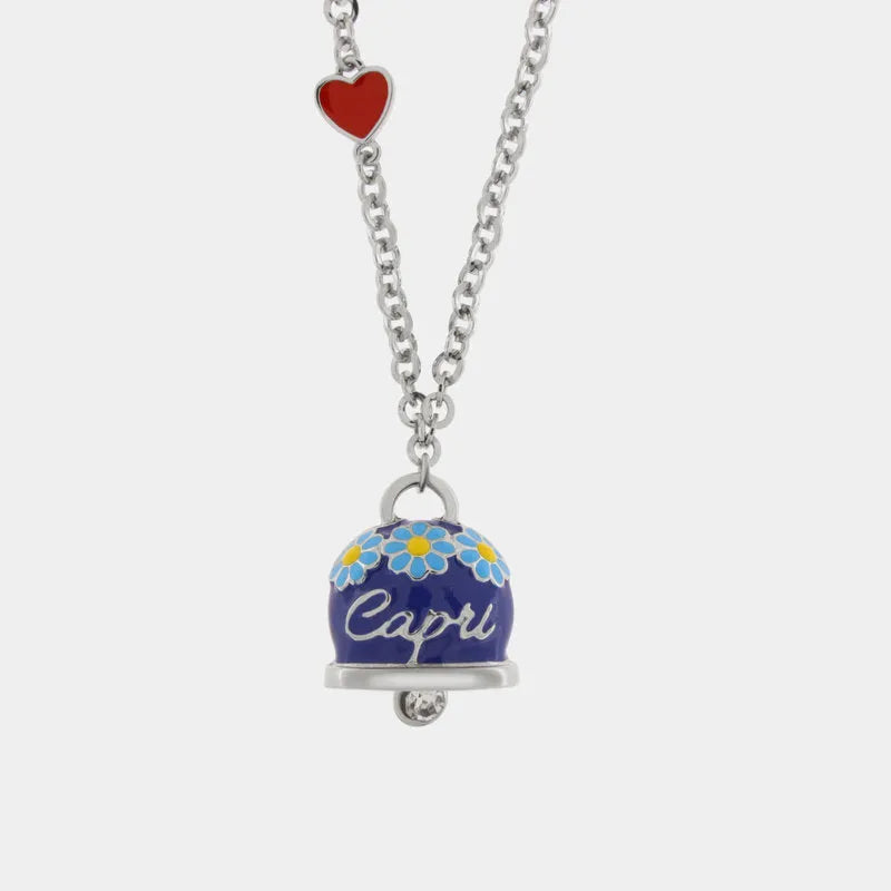 Collana in Metallo con campanella blu impreziosita da margherite e scritta capri
