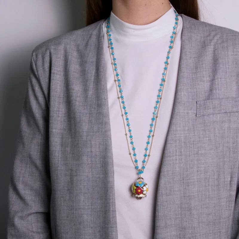 Collana in Metallo multifilo azzurra con campana a fiori multicolor