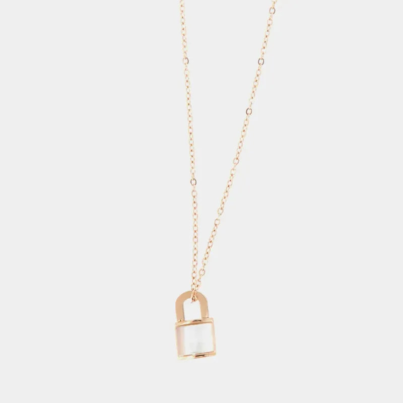 Halskette aus Stahl mit Anhänger in Form eines Vorhängeschlosses, verziert mit einem zentralen weißen Perlmutt-Effekt