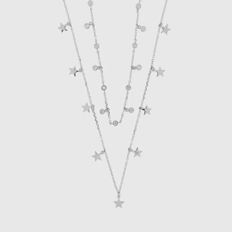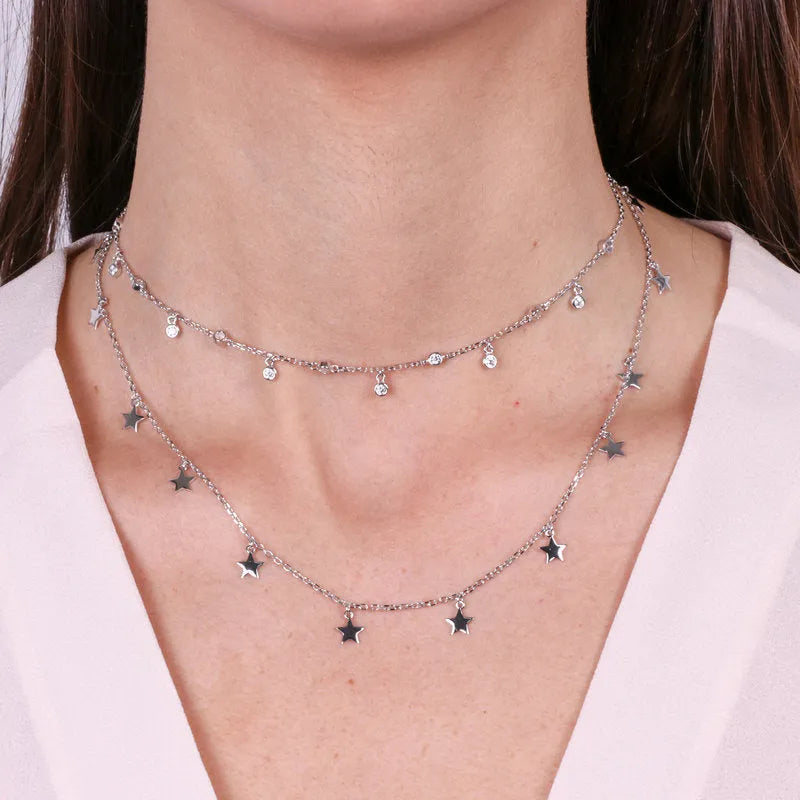 Collana in Argento 925 a doppia catena impreziosita da giro di stelline e zirconi bianchi pendenti