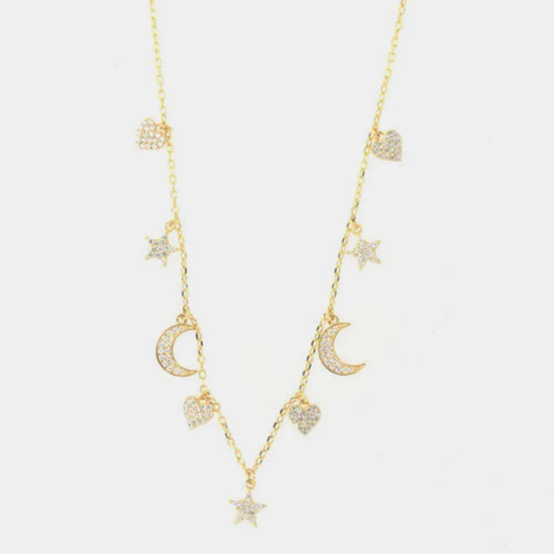 Collana in Argento 925 con pendenti a forma di cuori, stelle, lune con zirconi bianchi