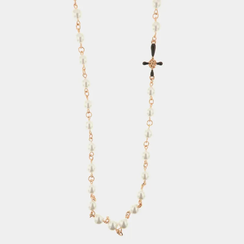 Collana in Metallo con perle bianche impreziosite da croce con cristalli neri