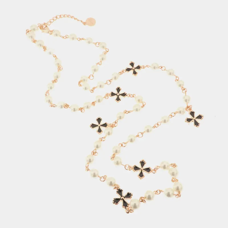 Collana in Metallo con perle bianche impreziosite da croci con cristalli neri