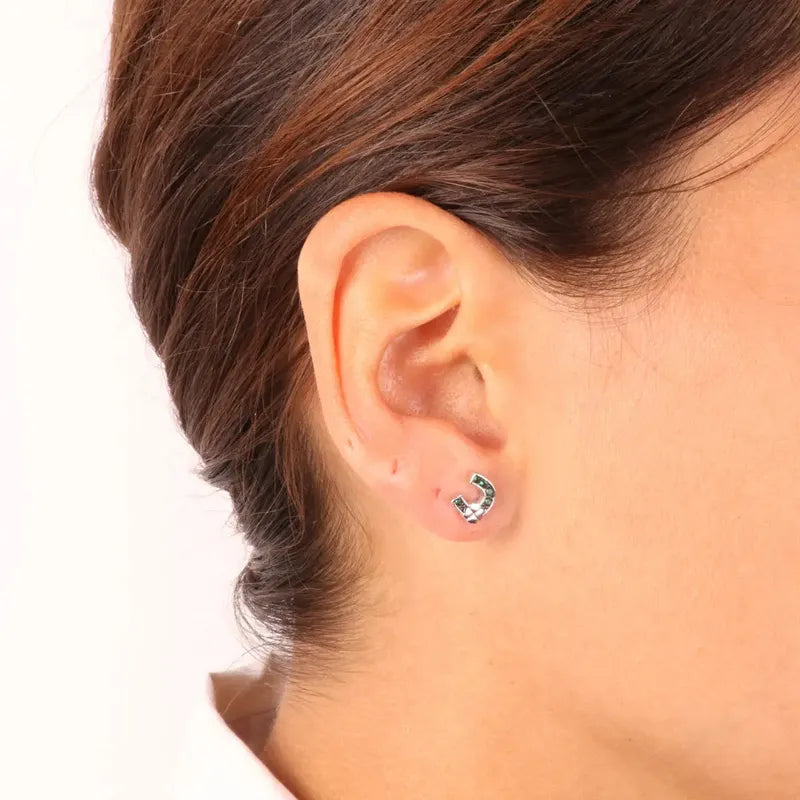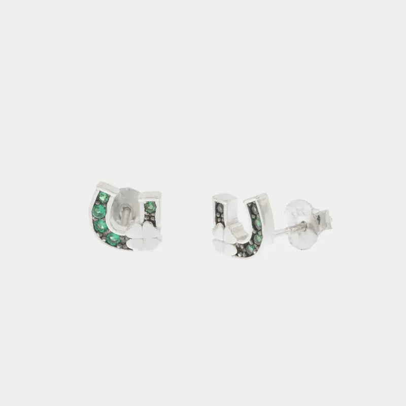 Ohrstecker aus 925er Silber in Form eines Hufeisens und eines vierblättrigen Kleeblatts mit grünen Zirkonia