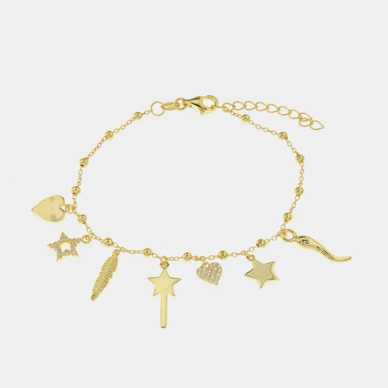 Bracciale in Argento 925 con ciondoli pendenti a cuore, stella, piuma , cornetto e bacchetta magica