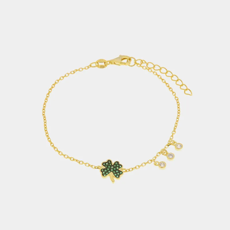 Bracciale in Argento 925 con ciondonolo a forma di quadrifoglio con zirconi verdi e tre punti luce pendenti laterali.