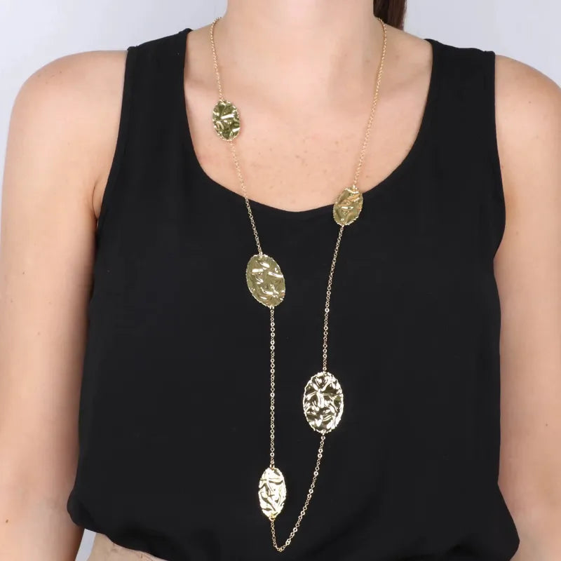Collana in Argento 925 a catena lunga, con piastre ovali martellate in stile etrusco