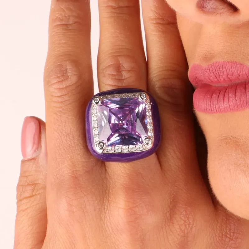 Ring aus 925er Silber, violett emailliert, mit zentralem violettem Zirkon und weißen Zirkonen