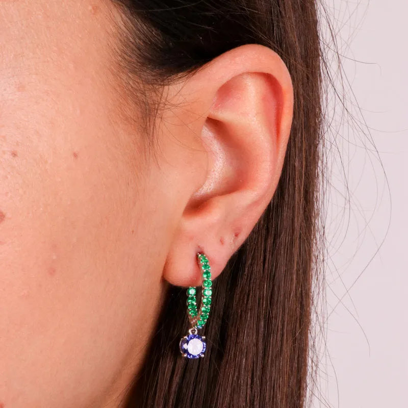 Orecchini in Argento 925 semicerchio con zirconi verdi e pendete viola