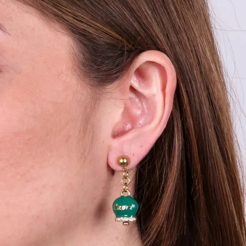 Orecchini in Acciaio con campanella verde placcata oro con scritta Capri