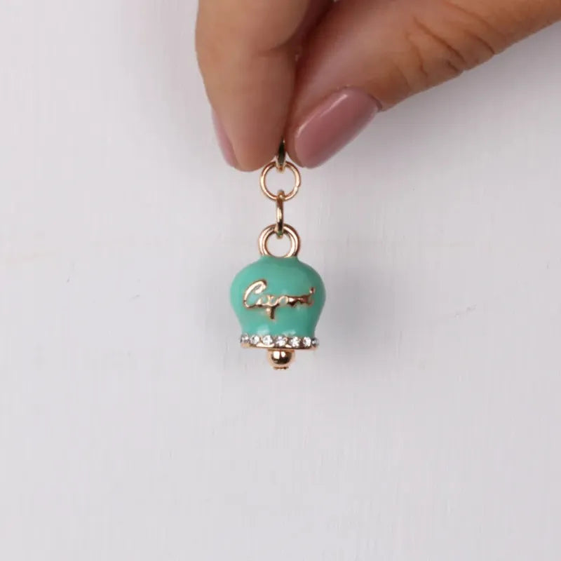 Metal pendant bell with green enamel and white crystals