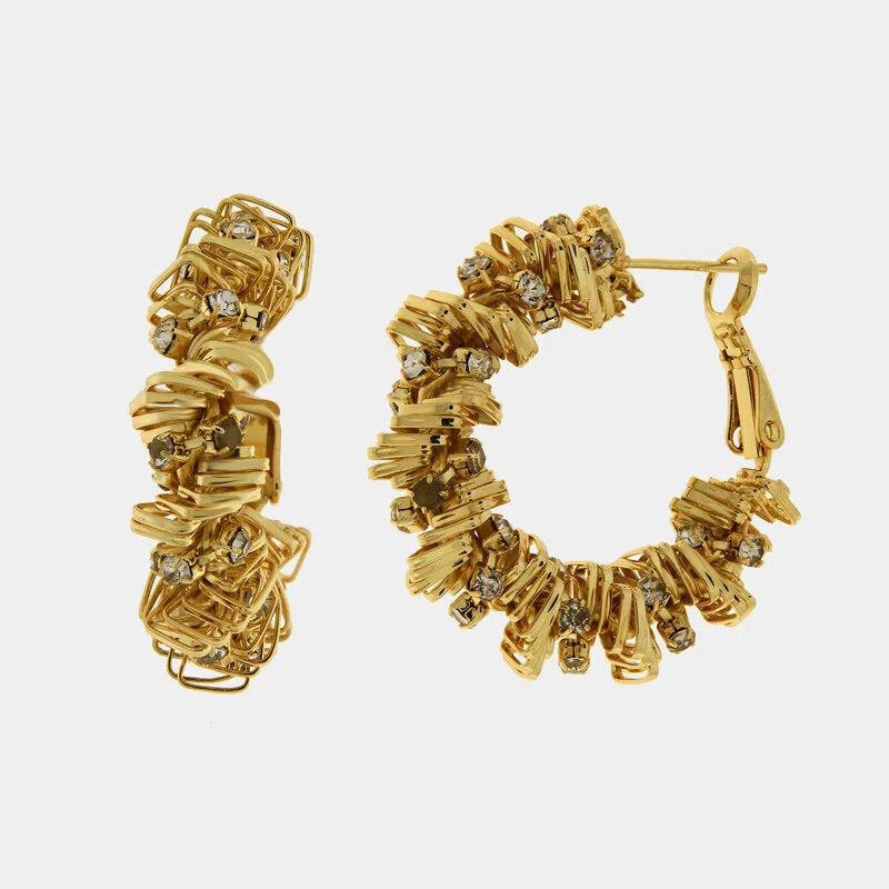 Orecchini in Metallo a cerchio donna dorati con elementi rettangolari sovrapposti effetto molla e cristalli luminosi trasparenti incastonati