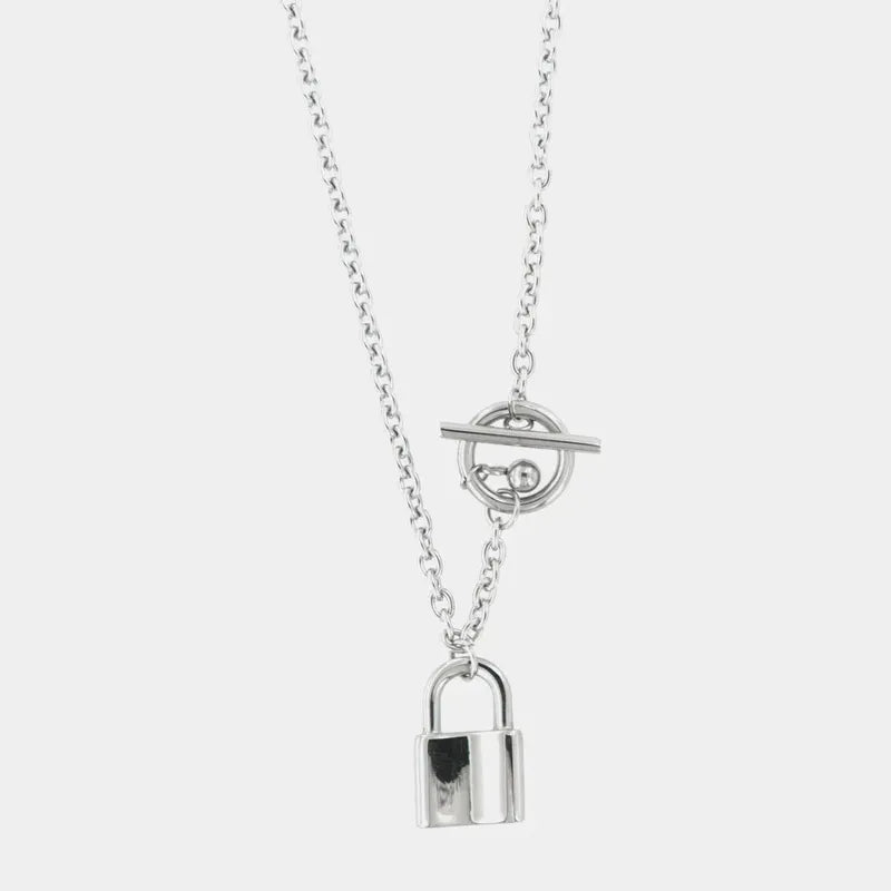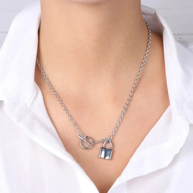 Steel necklace with side T clasp and shiny padlock-shaped pendant.