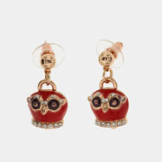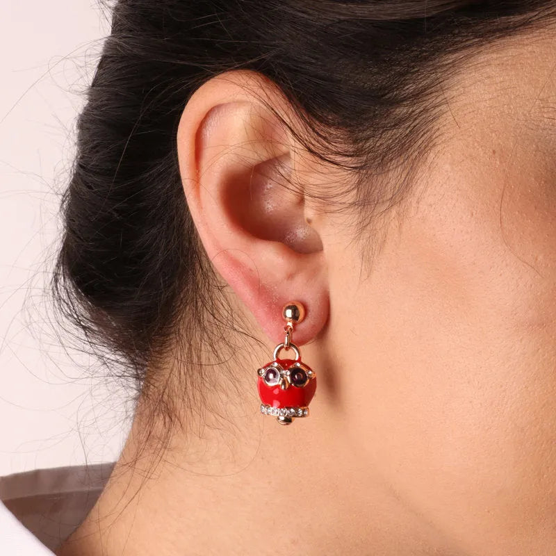 Orecchini in Metallo con campanella portafortuna a gufo, impreziosita da smalto rosso e cristalli