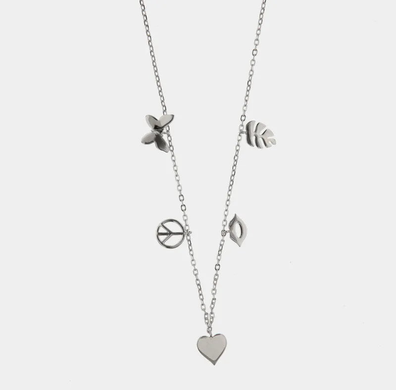 Collana in Argento 925 con ciondoli pendenti a forma di cuore, foglia, farfalla, bacio e peace