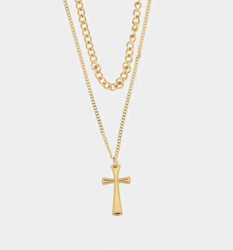Steel necklace with double chain adorned with a cross-shaped pendant