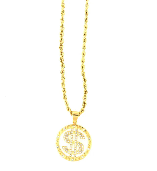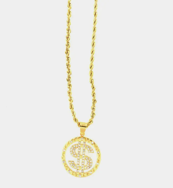 Steel necklace with pendant featuring the American dollar symbol adorned with crystals